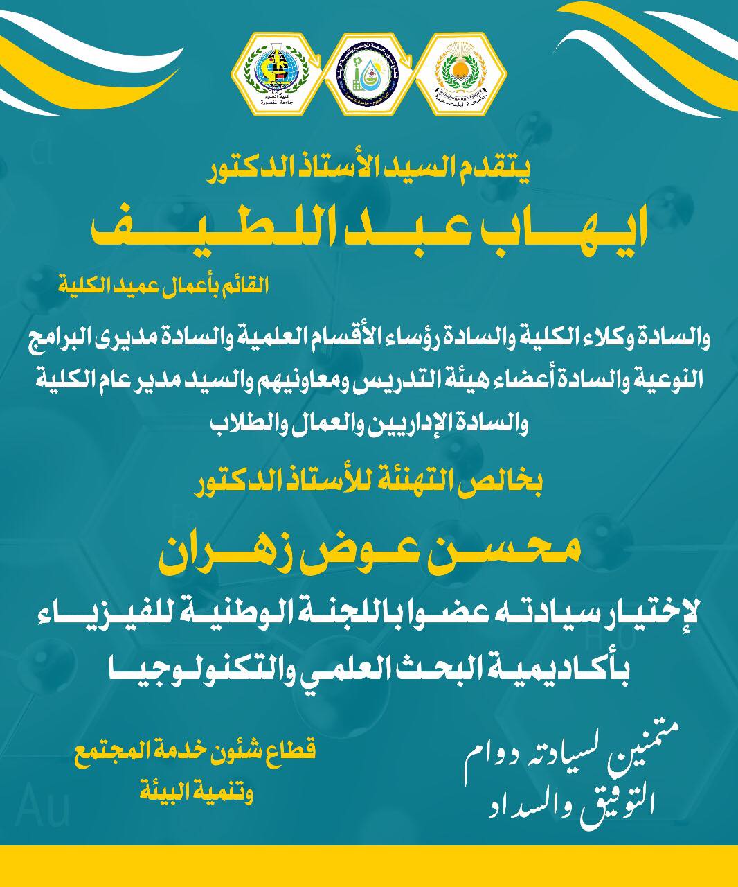 Previous Next 16 أكتوبر,2025 تهنئة ا.د / محسن زهران عضوية اللجنة الوطنية للفيزياء باكاديمية البحث العلمى والتكنولوجيا تهنئة الاستاذ الدكتور / محسن عوض زهران عضوية اللجنة الوطنية للفيزياء باكاديمية البحث العلمى والتكنولوجيا متمنيين لسيادته التوفيق والنجاح