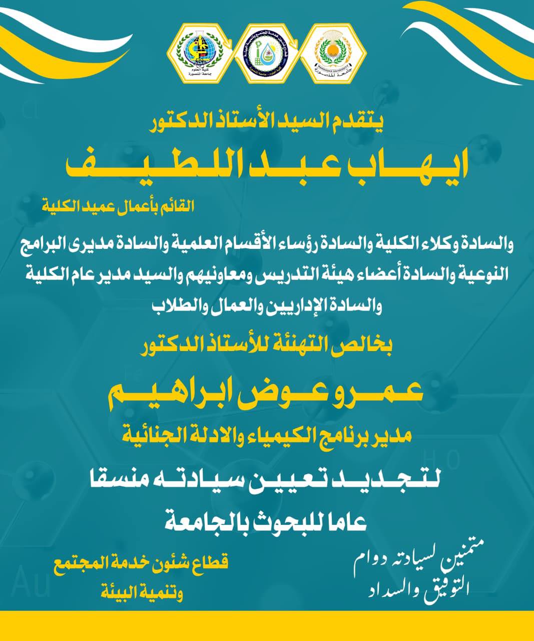 Previous Next 16 أكتوبر,2025 تهنئة أ.د/ عمرو عوض ابراهيم لتجديد تعيين سيادته منسقا عاما للبحوث بالجامعة تهنئة الاستاذ الدكتور/ عمرو عوض ابراهيم مدير برنامج الكيمياء والأدلة الجنائية لتجديد تعيين سيادته منسقا عاما للبحوث بالجامعة متمنيين لسيادتها التوفيق والنجاح