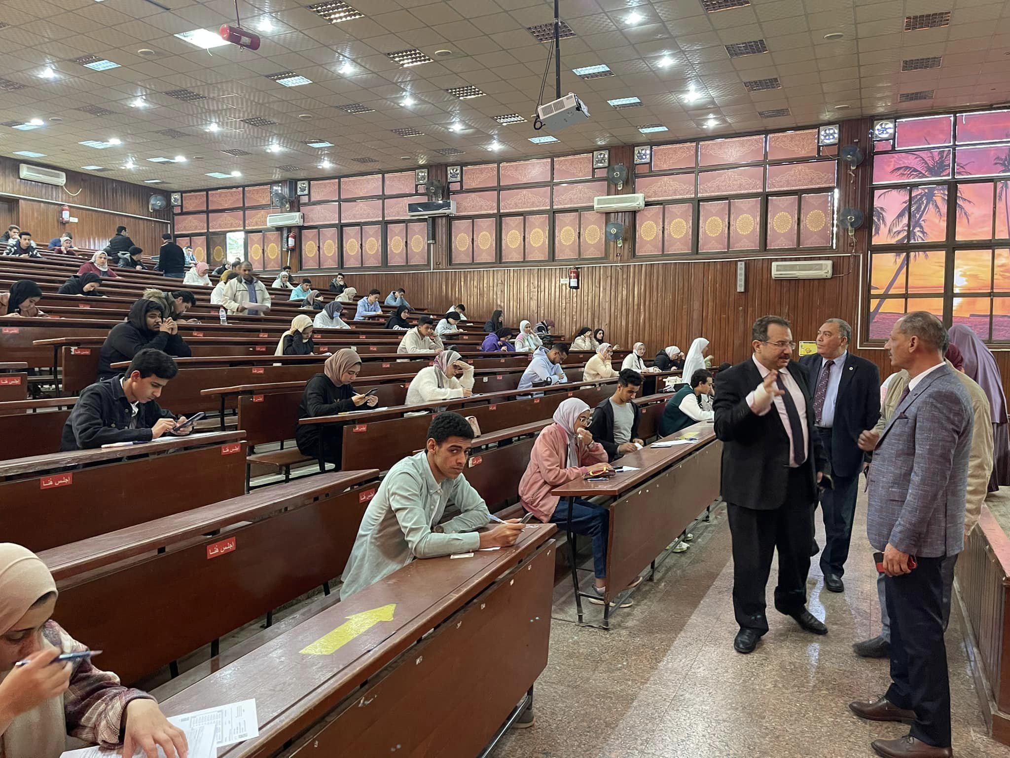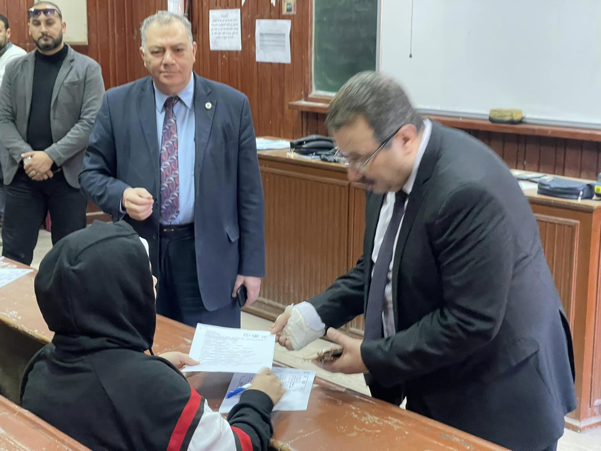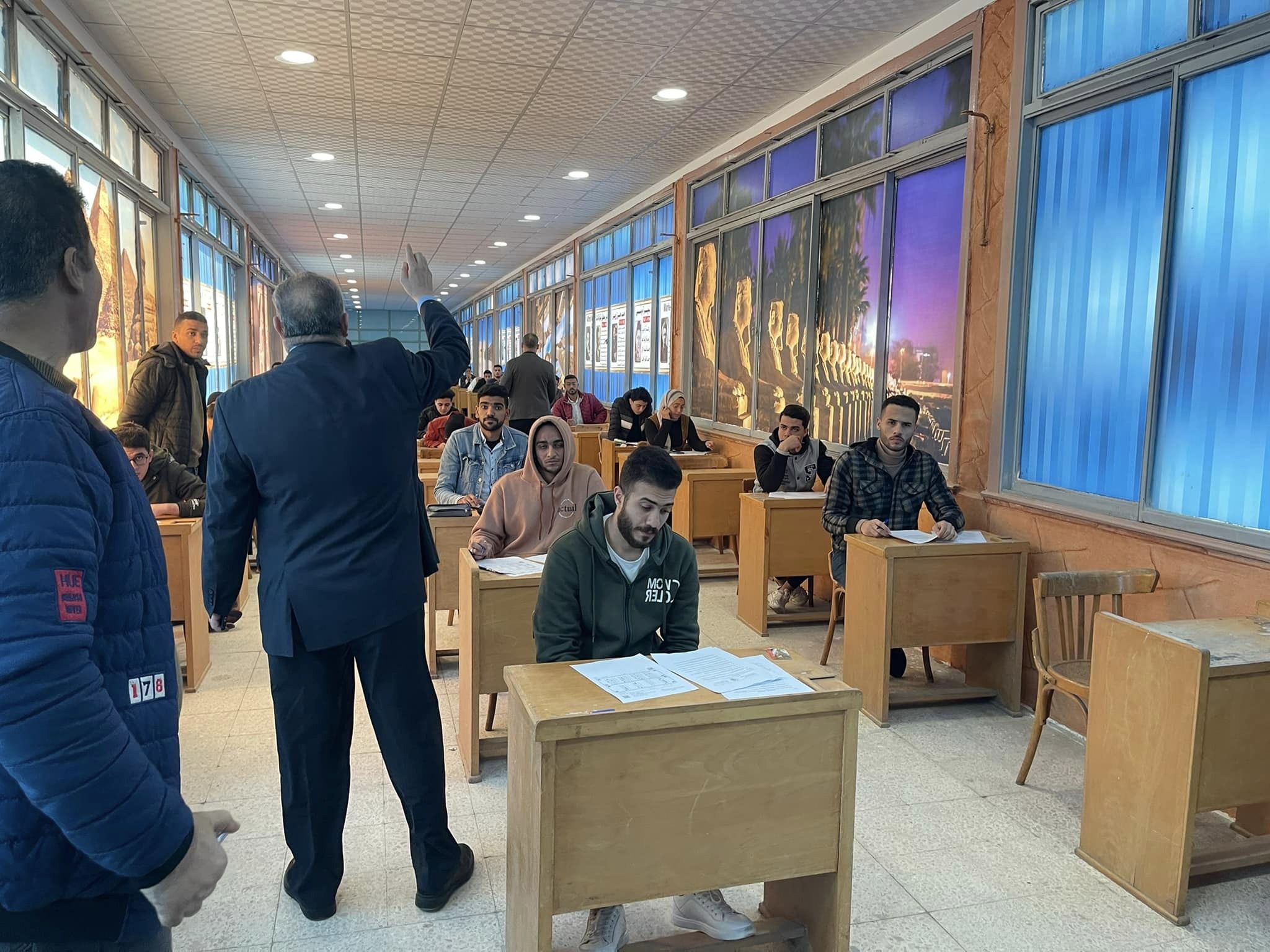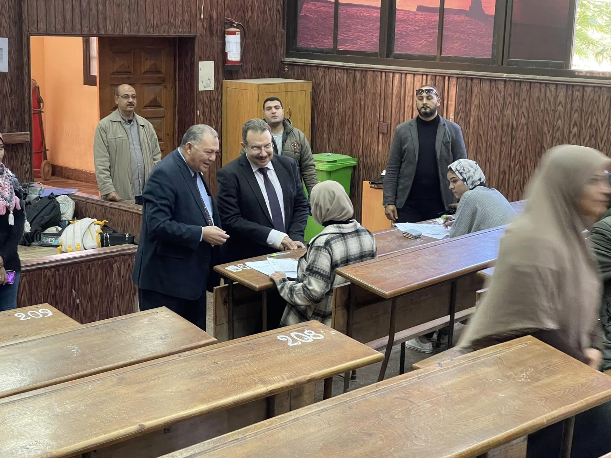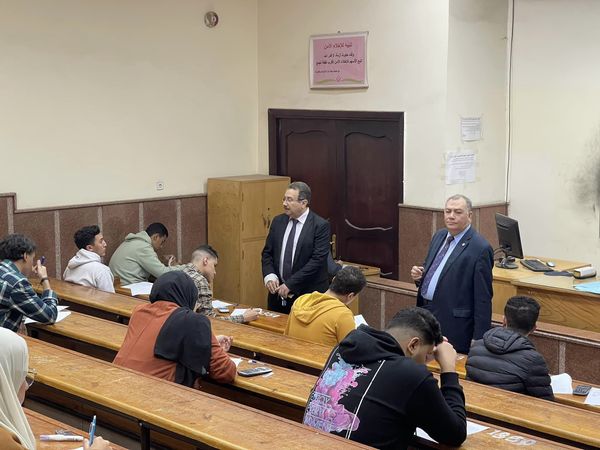 تفقد السيد أ.د/ أسامه العيان عميد الكلية يرافقه السيد أ.د / أحمد المحمودى وكيل الكلية لشئون التعليم والطلاب اليوم السبت الموافق 31 ديسمبر 2022 سير أول يوم من إمتحانات النهائى للفصل الدراسى الأول بالكلية للعام الجامعى ٢٠٢٢ / ٢٠٢٣ والتى ستستمر حتى الأربعاء الموافق 25 يناير 2023 حيث تفقدوا سيادتهم العمل بالكنترول المركزى والكنترولات الفرعية ومركز التصوير وغرفة التصحيح الإليكترونى بالكلية وكذلك سير عملية الإمتحانات وإنتظامها بلجان الامتحانات والتأكد من تنفيذ كافة التعليمات الصادره من إداره الكلية بشأن قواعد الإمتحانات كما اكد أ.د/ أحمد المحمودى على ضروره الالتزام بتنفيذ التعليمات الخاصه والقواعد المنظمة لها وأكد سيادته وقام بالتنبيه بأنه ووفقا لقواعد الإمتحانات فإنه يمنع عدم إصحاب التليفون المحمول نهائيا داخل اللجان الإمتحانية .