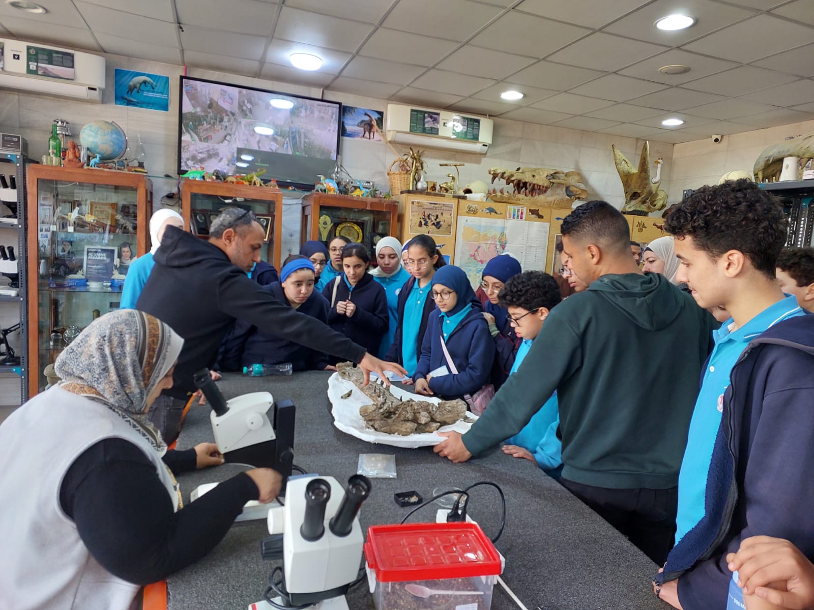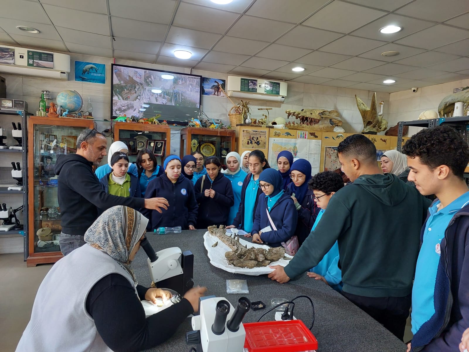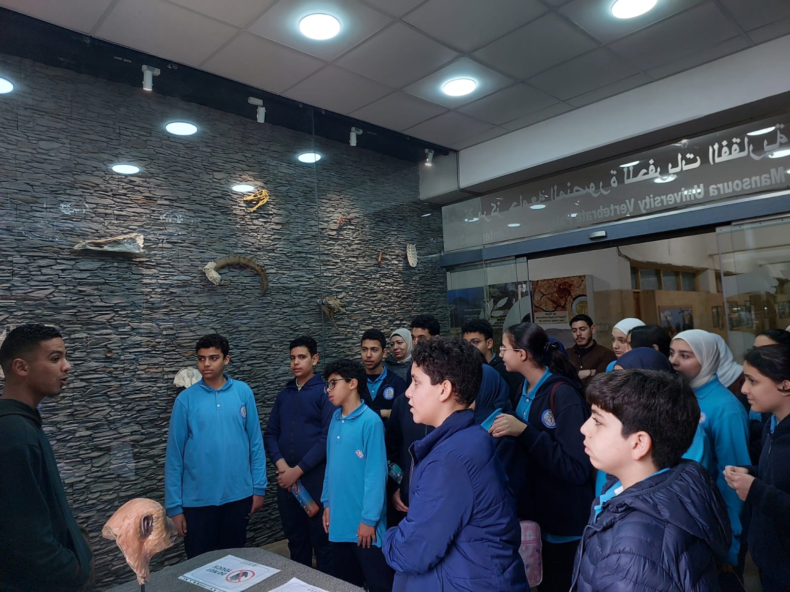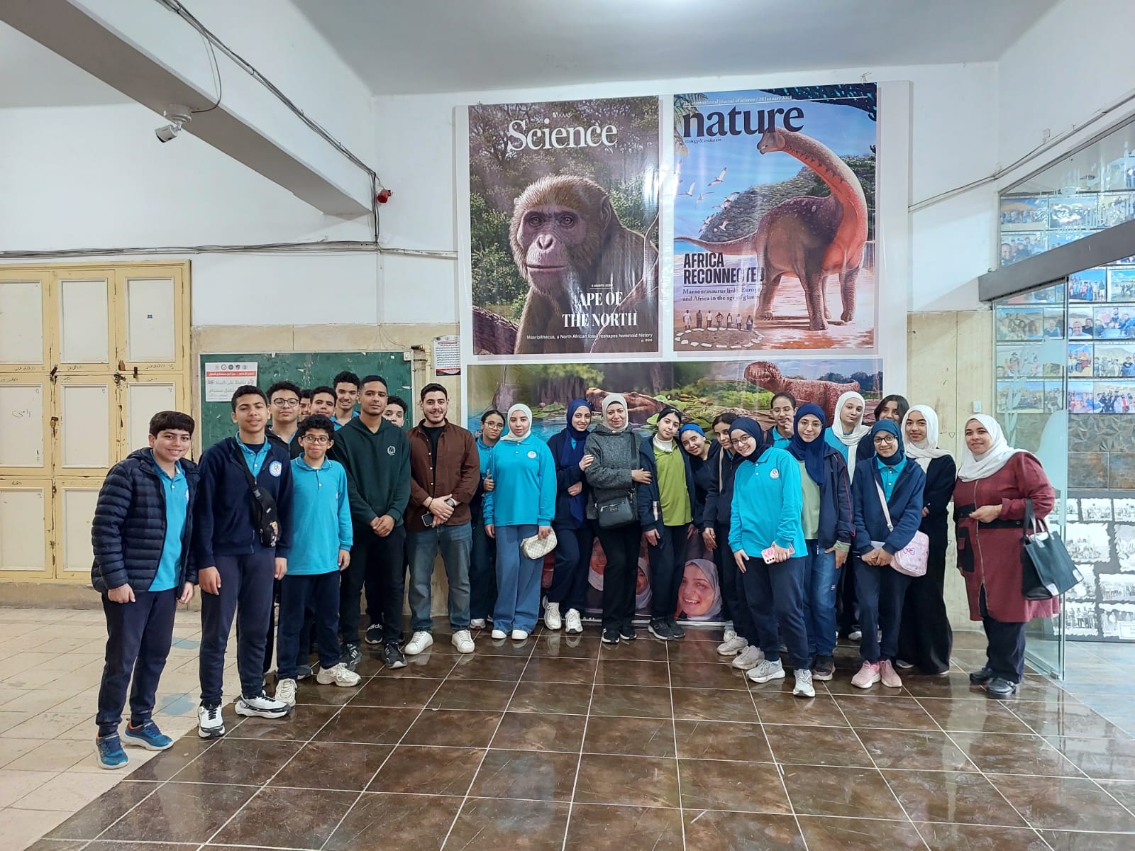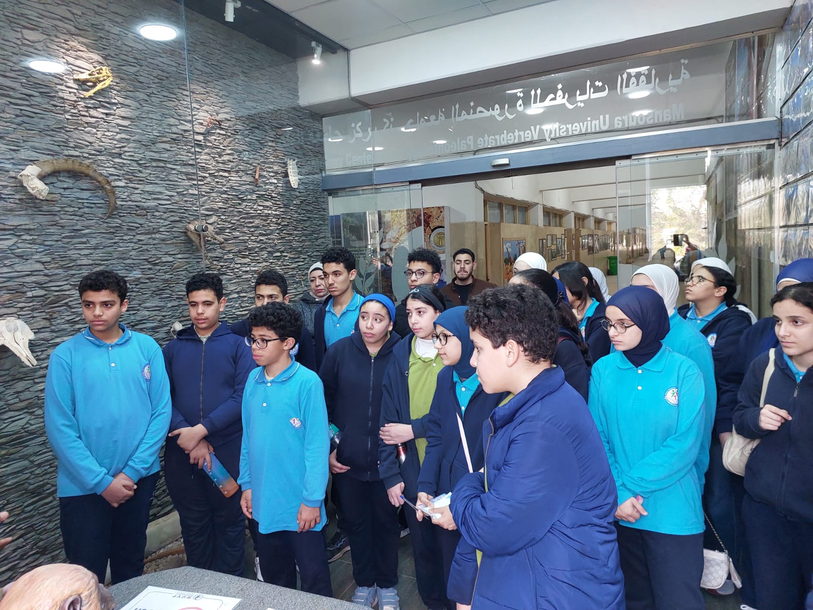 تحت رعاية السيد الأستاذ الدكتور/ شريف خاطر رئيس جامعة المنصورة وريادة السيد الأستاذ الدكتور / طارق غلوش المشرف علي قطاع شئون خدمة المجتمع وتنمية البيئة وريادة سعادة الأستاذ الدكتور/ ايهاب عبد اللطيف عطية قائم بعمل عميد الكلية وإشراف سعادة الأستاذ الدكتور/ محمد فتحى ابو النور وكيل الكلية لشئون خدمة المجتمع وتنمية البيئة استقبل قطاع شئون خدمة المجتمع وتنمية البيئة يوم الأربعاء الموافق 8 ابريل 2026 واحدة من أنشطة مديرية التربية والتعليم بالدقهلية للزيارات المدرسية خلال الفصل الدراسى الثاني للعام الدراسى 2025 / 2026 بزيارة من مدرسة " المنصورة المتميزة (1 ) للغات "تم استهلال الزيارة باستضافة وفد المدرسة من السادة المشرفين أ. نسرين بدوي الجبالي لخصائي اجتماعي و أ. دعاء السيد أحمد معلم العلوم و أ. أحمد أسامة أحمد معلم التربية الرياضية بمكتب السيد أ.د/ وكيل الكلية لشئون البيئة حيث قام سيادته بإلقاء كلمة ترحيب بالوفد والطلاب المشاركين فى الزيارة وأستعرض سيادته أهمية كلية العلوم ودورها فى نهضة المجتمع وتنميته وان لدى كلية العلوم علماء من أعضاء هيئة التدريس من بين الأكثر تأثيرا فى العالم وان هناك العديد من خريجى كلية العلوم قد حصلوا على جوائز نوبل فى العلوم المختلفة وحث الطلاب على الاجتهاد والمثابرة وباشر الوفد زيارته للكلية الي قسم علم الحيوان بصحبة الدكتور / مصطفى داود المدرس بقسم علم الحيوان وجولة علي بانوراما ومتاحف القسم ثم الي مركز المنصورة للحفريات الفقارية حيث استضاف الوفد السيد أ.د/ هشام سلام مؤسس المركز في جولة عبر الازمنة المختلفة من بداية القشرة الارضية ومراحل تطور الحيوانات المنقرضة من الديناصورات وخلافها وأماكن تواجد حفرياتها في الوحات المختلفة في مصر واستعرض اهم الاكتشافات فيه ثم عقبها محاضرة للباحث حسام السقا وأجدد الاكتشافات بالمركز