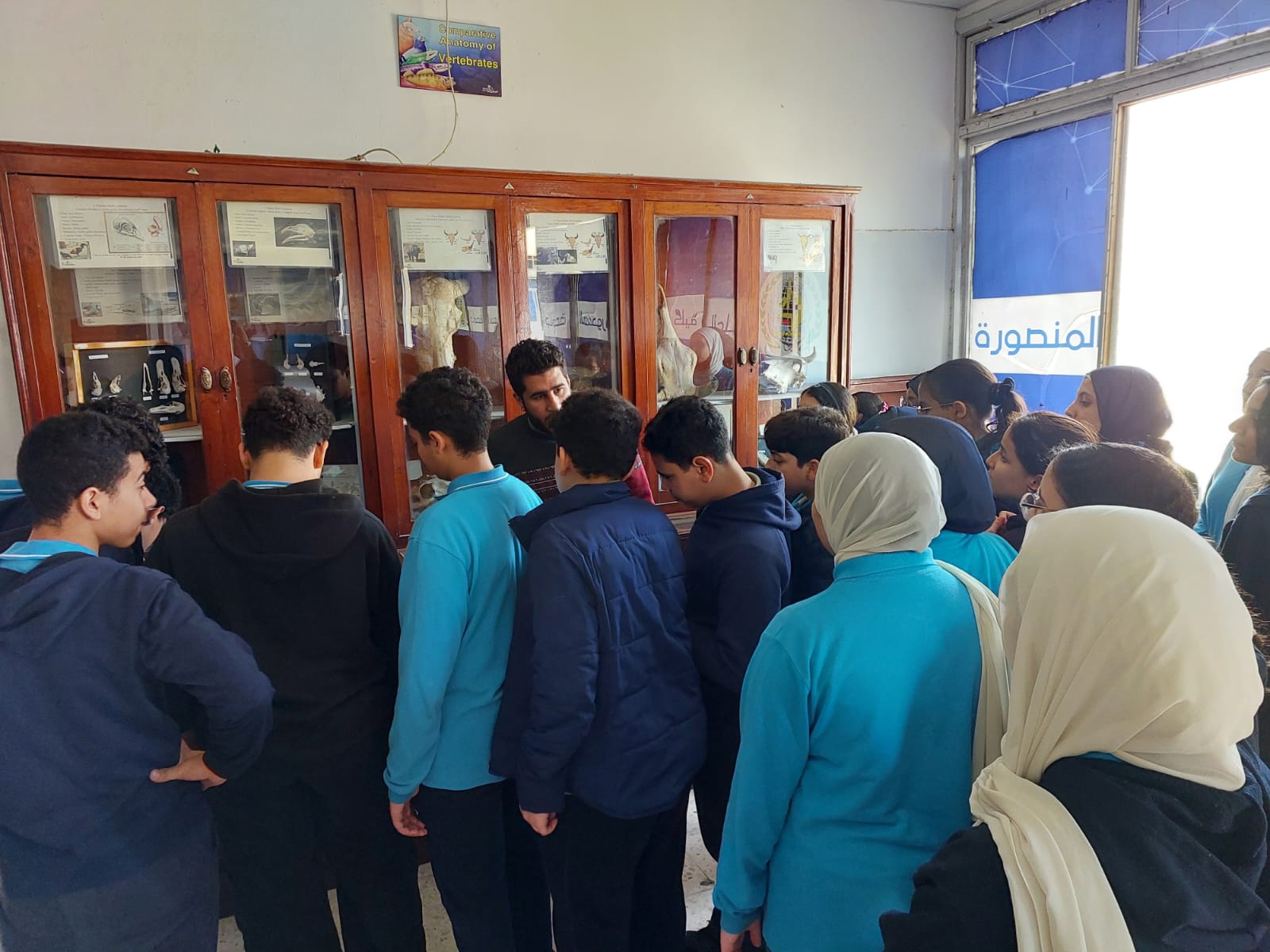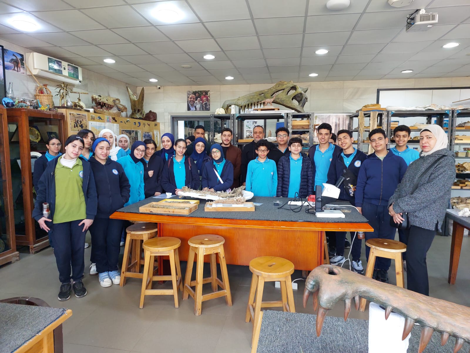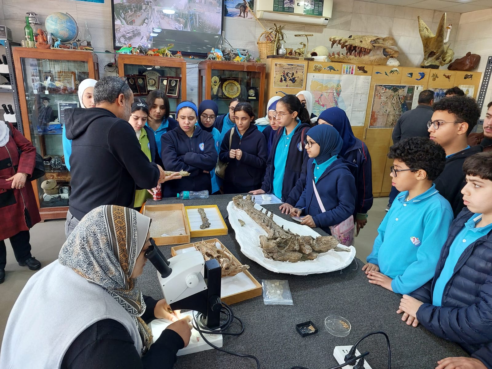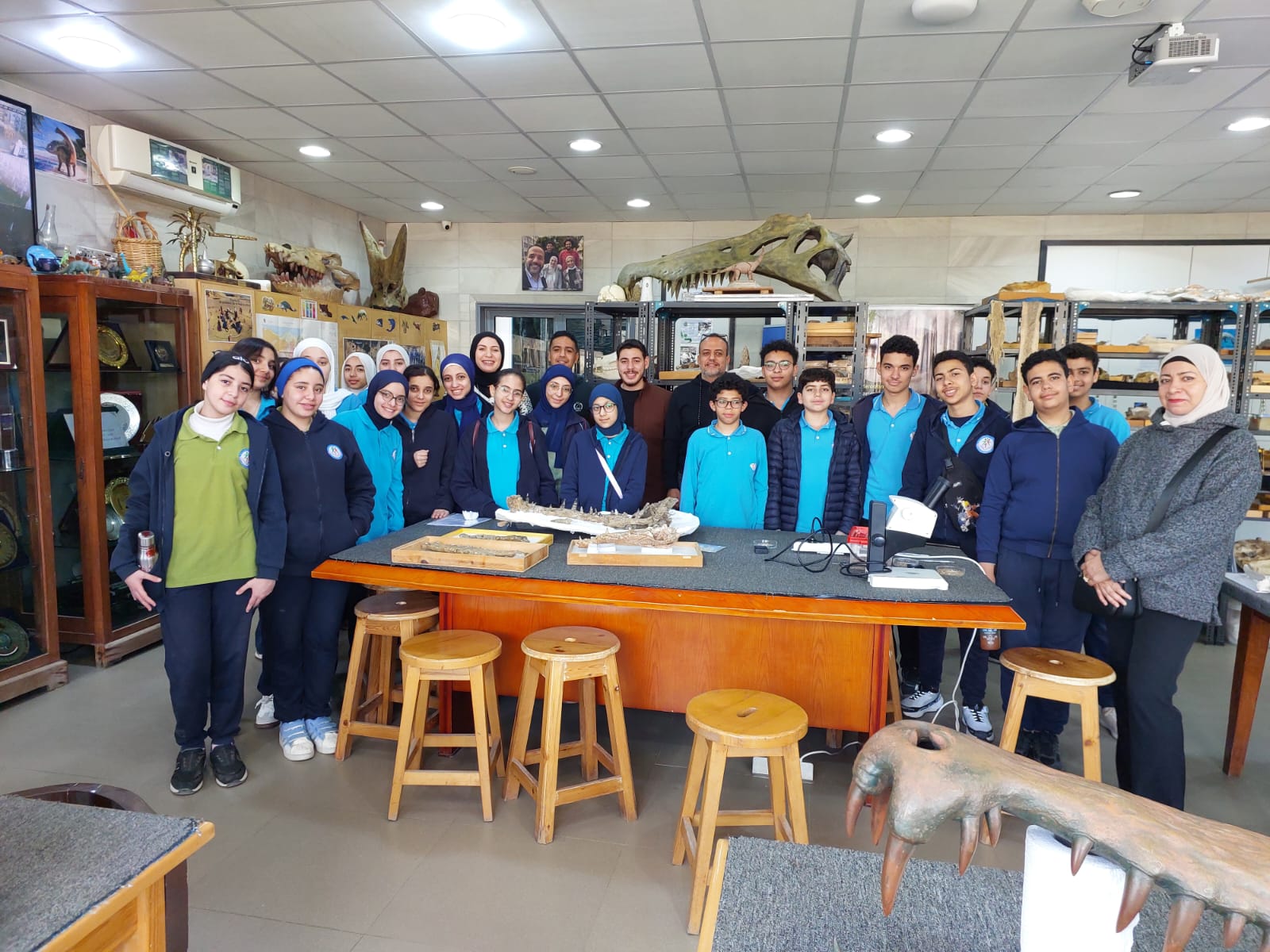 تحت رعاية السيد الأستاذ الدكتور/ شريف خاطر رئيس جامعة المنصورة وريادة السيد الأستاذ الدكتور / طارق غلوش المشرف علي قطاع شئون خدمة المجتمع وتنمية البيئة وريادة سعادة الأستاذ الدكتور/ ايهاب عبد اللطيف عطية قائم بعمل عميد الكلية وإشراف سعادة الأستاذ الدكتور/ محمد فتحى ابو النور وكيل الكلية لشئون خدمة المجتمع وتنمية البيئة استقبل قطاع شئون خدمة المجتمع وتنمية البيئة يوم الأربعاء الموافق 8 ابريل 2026 واحدة من أنشطة مديرية التربية والتعليم بالدقهلية للزيارات المدرسية خلال الفصل الدراسى الثاني للعام الدراسى 2025 / 2026 بزيارة من مدرسة " المنصورة المتميزة (1 ) للغات "تم استهلال الزيارة باستضافة وفد المدرسة من السادة المشرفين أ. نسرين بدوي الجبالي لخصائي اجتماعي و أ. دعاء السيد أحمد معلم العلوم و أ. أحمد أسامة أحمد معلم التربية الرياضية بمكتب السيد أ.د/ وكيل الكلية لشئون البيئة حيث قام سيادته بإلقاء كلمة ترحيب بالوفد والطلاب المشاركين فى الزيارة وأستعرض سيادته أهمية كلية العلوم ودورها فى نهضة المجتمع وتنميته وان لدى كلية العلوم علماء من أعضاء هيئة التدريس من بين الأكثر تأثيرا فى العالم وان هناك العديد من خريجى كلية العلوم قد حصلوا على جوائز نوبل فى العلوم المختلفة وحث الطلاب على الاجتهاد والمثابرة وباشر الوفد زيارته للكلية الي قسم علم الحيوان بصحبة الدكتور / مصطفى داود المدرس بقسم علم الحيوان وجولة علي بانوراما ومتاحف القسم ثم الي مركز المنصورة للحفريات الفقارية حيث استضاف الوفد السيد أ.د/ هشام سلام مؤسس المركز في جولة عبر الازمنة المختلفة من بداية القشرة الارضية ومراحل تطور الحيوانات المنقرضة من الديناصورات وخلافها وأماكن تواجد حفرياتها في الوحات المختلفة في مصر واستعرض اهم الاكتشافات فيه ثم عقبها محاضرة للباحث حسام السقا وأجدد الاكتشافات بالمركز