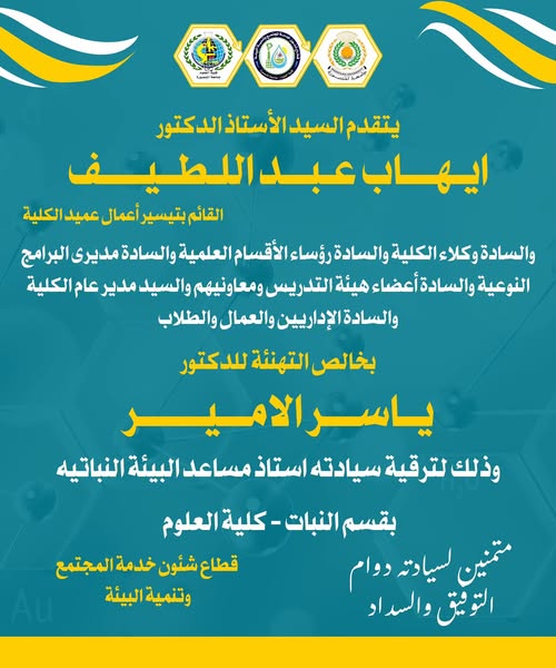Previous Next 31 أغسطس,2025 تهنئة الدكتور/ ياسر الامير الترقية استاذ مساعد البيئة النباتيه بقسم النبات تهنئة الدكتور/ ياسر الامير الترقية استاذ مساعد البيئة النباتيه بقسم النبات متمنيين لسيادته دوام التوفيق