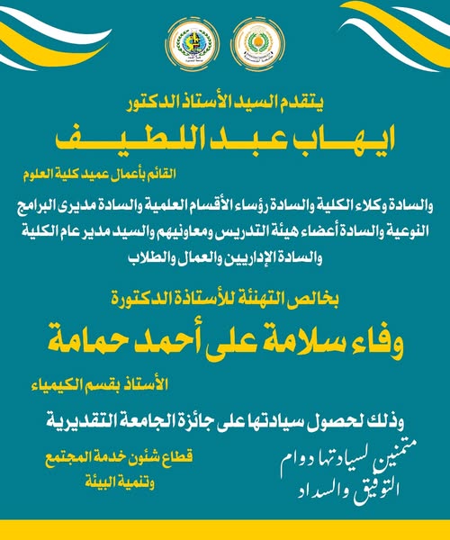 Previous Next 18 أكتوبر,2025 تهنئة أ.د/ وفاء سلامه لحصول سيادتها على جائزة الجامعة التقديرية تهنئة الاستاذة الدكتور/ وفاء سلامه على احمد حمامه الاستاذ بقسم الكيمياء لحصول سيادتها على جائزة الجامعة التقديرية متمنيين لسيادتها التوفيق والنجاح
