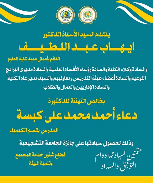 Previous Next 18 أكتوبر,2025 تهنئة د/ دعاء أحمد محمد على كسبة لحصول سيادتها على جائزة الجامعة التشجيعية تهنئة الدكتورة/ دعاء أحمد محمد على كسبة المدرس بقسم الكيمياء لحصول سيادتها على جائزة الجامعة التشجيعية متمنيين لسيادتها التوفيق والنجاح