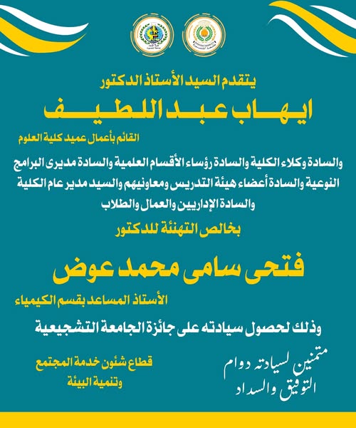 Previous Next 18 أكتوبر,2025 تهنئة د/ فتحى سامى محمد عوض لحصول سيادتها على جائزة الجامعة التشجيعية تهنئة الدكتور/ فتحى سامى محمد عوض الاستاذ المساعد بقسم الكيمياء لحصول سيادتها على جائزة الجامعة التشجيعية متمنيين لسيادته التوفيق والنجاح