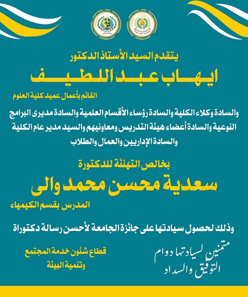 Previous Next 18 أكتوبر,2025 تهنئة د/ سعدية محسن محمد والى لحصول سيادتها على جائزة الجامعة لاحسن رسالة دكتوراه تهنئة الدكتورة/ سعدية محسن محمد والى المدرس بقسم الكيمياء لحصول سيادتها على جائزة الجامعة لاحسن رسالة دكتوراه متمنيين لسيادتها التوفيق والنجاح