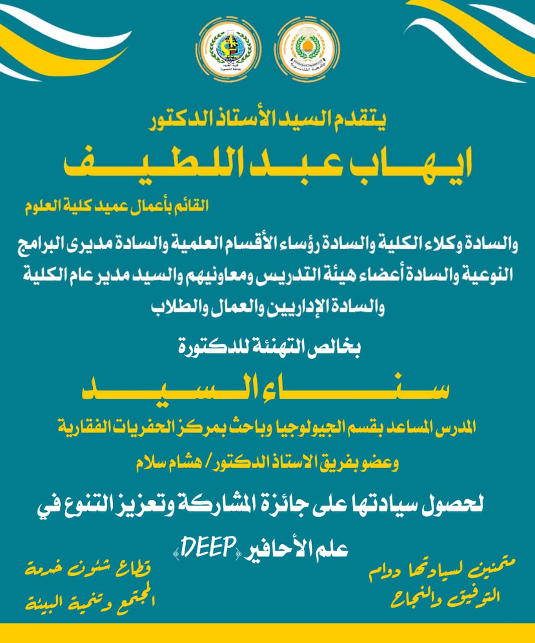 تهنئة الدكتورة/ سناء السيد المدرس المساعد بقسم الجيولوجيا وباحث بمركز الحفريات الفقارية وعضو بفريق الاستاذ الدكتور / هشام سلام