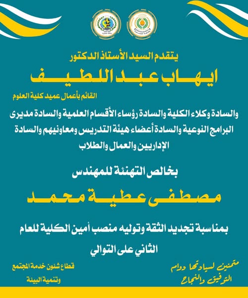 Previous Next 22 أكتوبر,2025 تهنئة للمهندس/ مصطفى عطيه لتجديد ثقة معالى رئيس الجامعة بسيادته أمينًا للكلية متمنيين لسيادته التوفيق والسداد تهنئة المهندس/ مصطفى عطيه لتجديد ثقة معالى رئيس الجامعة بسيادته أمينًا للكلية متمنيين لسيادته التوفيق والسداد