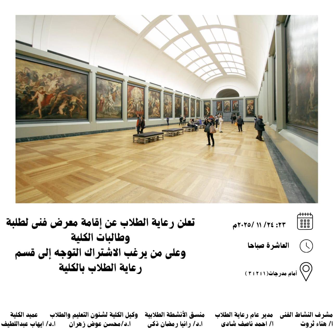 ويدعو جميع الموهوبين للمشاركة بأعمالهم الفنية، حيث يُعد المعرض فرصة مميزة لإظهار إبداعات الطلبة وتنمية مهاراتهم وتعزيز روح المشاركة والابتكار داخل الكلية.