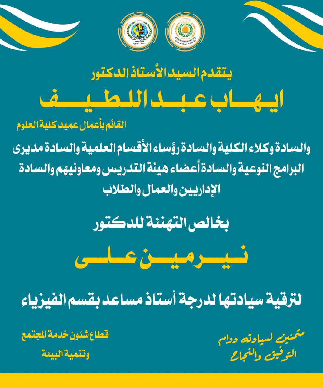 Previous Next 18 ديسمبر,2025 تهنئة الدكتوره/ نيرمين درجة استاذ مساعد بقسم الفيزياء تهنئة الدكتوره/ نيرمين على لترقية سيادتها استاذ مساعد بقسم الفيزياء متمنيين لسيادتها دوام الرقى والتقدم
