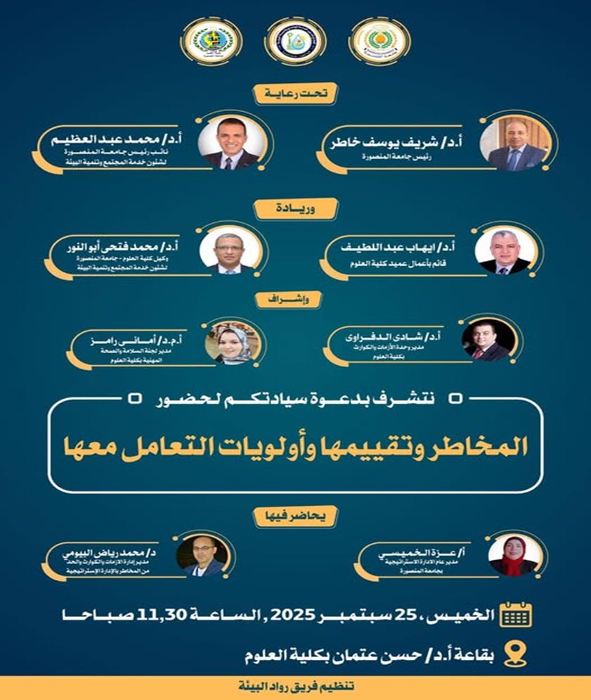 و فى اطار توعية منسوبى الكلية بالمخاطر وكيفية التعامل معها وتجنب حدوثها فقد قام قطاع خدمة المجتمع وتنمية البيئة بالكلية متمثلا فى جناحان من أجنحته وهما وحدة ادارة الازمات والكوارث تحت اشراف الاستاذ الدكتور/ شادى محمد الدفراوي ولجنة السلامة والصحة المهنية تحت اشراف الدكتورة/ أمانى محمد رامز بتنظيم ورشة عمل ورشة عمل بعنوان: "المخاطر وتقييمها وأولويات التعامل معها" وذلك يوم الخميس الموافق ٢٥ سبتمبر 2025 الساعه ١١.٣٠ ص بقاعة الاستاذ الدكتور/ حسن عتمان بالدور الرابع بالكلية حيث قام بادارة الورشة وتقديمها كلا من: