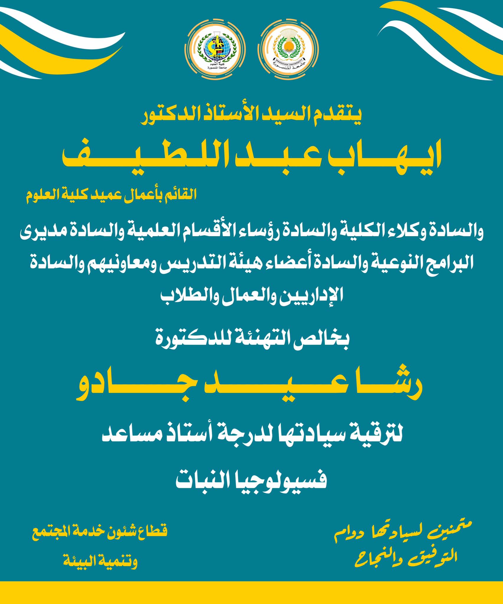 Previous Next 25 يناير,2026 تهنئة الدكتورة/ رشا عيد جادو ترقية سيادتها استاذ مساعد فسيولوجيا النبات تهنئة الدكتورة/ رشا عيد جادو ترقية سيادتها استاذ مساعد فسيولوجيا النبات متمنيين لسيادتها دوام التوفيق والنجاح