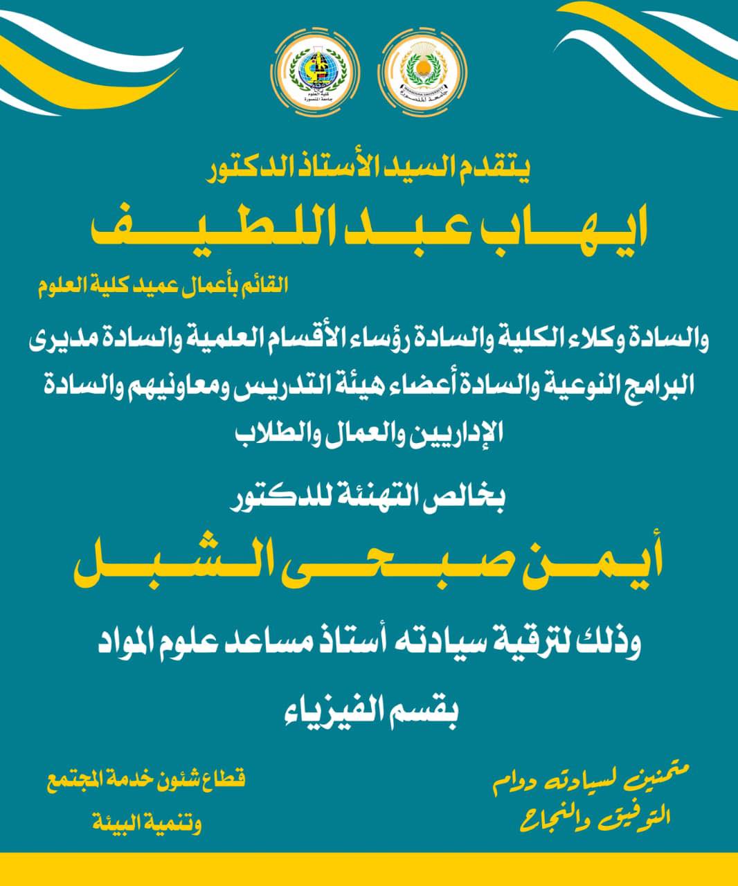 Previous Next 25 يناير,2026 تهنئة الدكتور/ أيمن صبحى الشبل لترقية سيادته استاذ مساعد علوم المواد بقسم الفيزياء تهنئة الدكتور/ أيمن صبحى الشبل لترقية سيادته استاذ مساعد علوم المواد بقسم الفيزياء متمنيين لسيادته التوفيق والنجاح