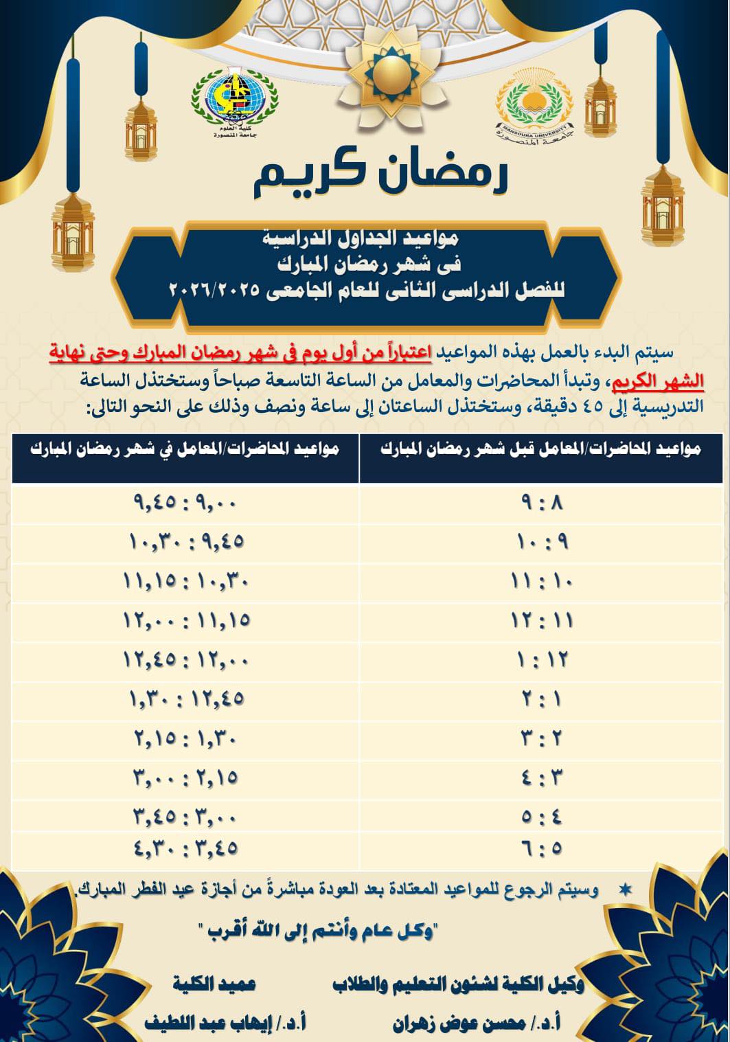 مواعيد الجداول الدراسية في شهر رمضان المبارك للفصل الدراسي الثاني للعام الجامعي 2025/2026