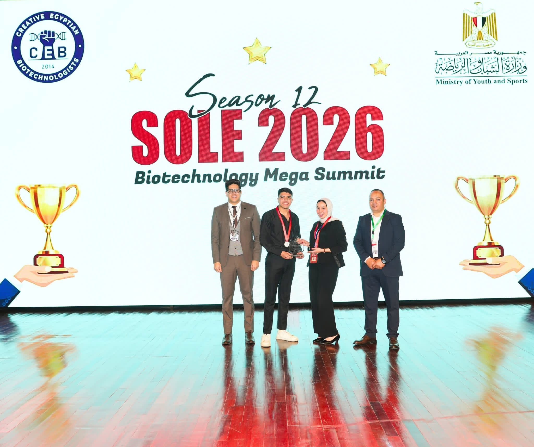 مشاركة مشرفة وإنجاز متميز لطلاب برنامج التكنولوجيا الحيوية وتطبيقاتها – كلية العلوم – جامعة المنصورة في فعاليات الموسم الثاني عشر من مسابقة SOLE 2026، والتي أُقيمت بالجامعة الأمريكية بالقاهرة (AUC) برعاية وزارة الشباب والرياضة.