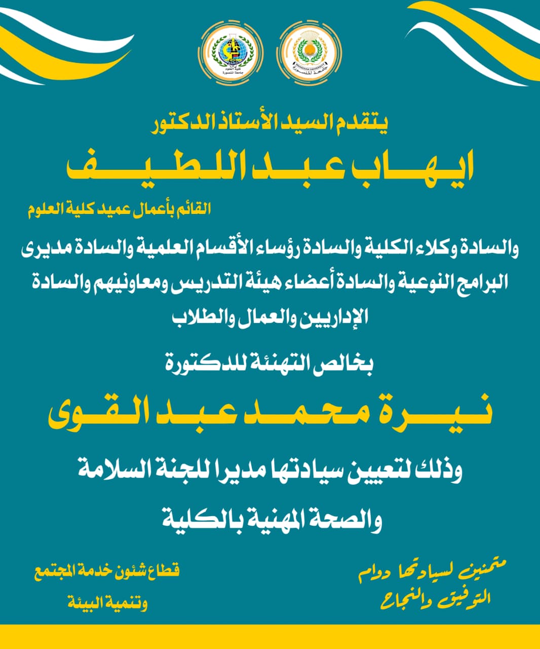 Previous Next 12 أبريل,2026 تهنئة د/ نيره محمد عبد القوى تعيين سيادتها منصب مدير لجنة السلامة والصحة المهنية بالكلية تهنئة الدكتوره/ نيره محمد عبد القوى المدرس بقسم الفيزياء لتولى سيادتها منصب مدير لجنة السلامة والصحة المهنية بالكلية متمنيين لسيادتها التوفيق والسداد