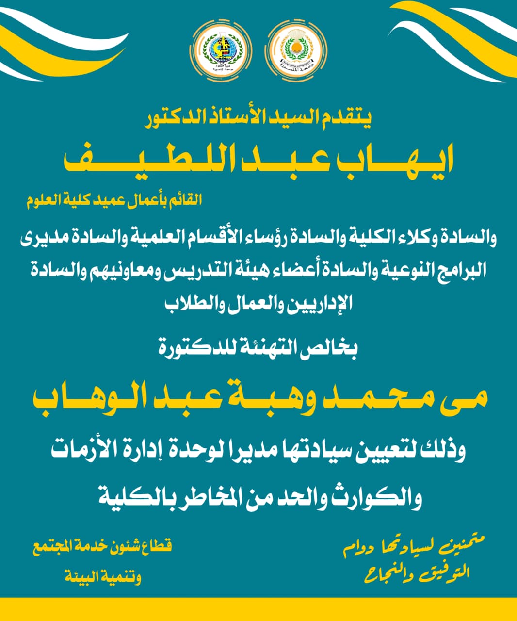 تهنئة الدكتوره/ مى محمد وهبه عبد الوهاب المدرس بقسم النبات لتولى سيادتها منصب مدير وحدة إدارة الأزمات والكوارث والحد من المخاطر بالكلية