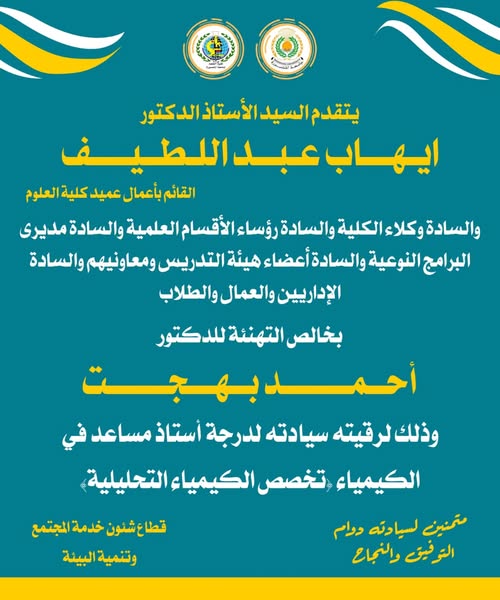 Previous Next 12 أبريل,2026 تهنئة د/ احمد بهجت لترقية سيادته أستاذ مساعد الكيمياء التحليلية بالكلية تهنئة الدكتور/ احمد بهجت لترقية سيادته أستاذ مساعد الكيمياء التحليلية بالكلية متمنيين لسيادتها التوفيق والنجاح